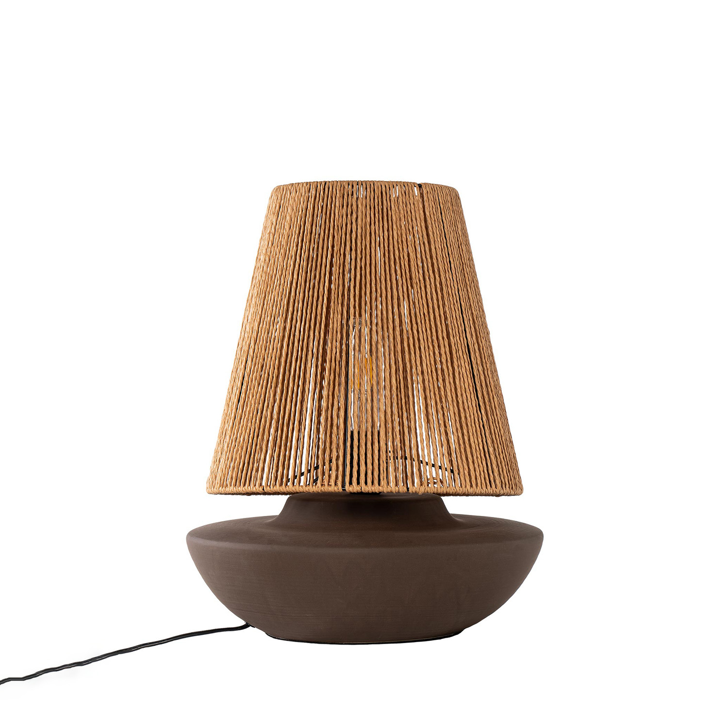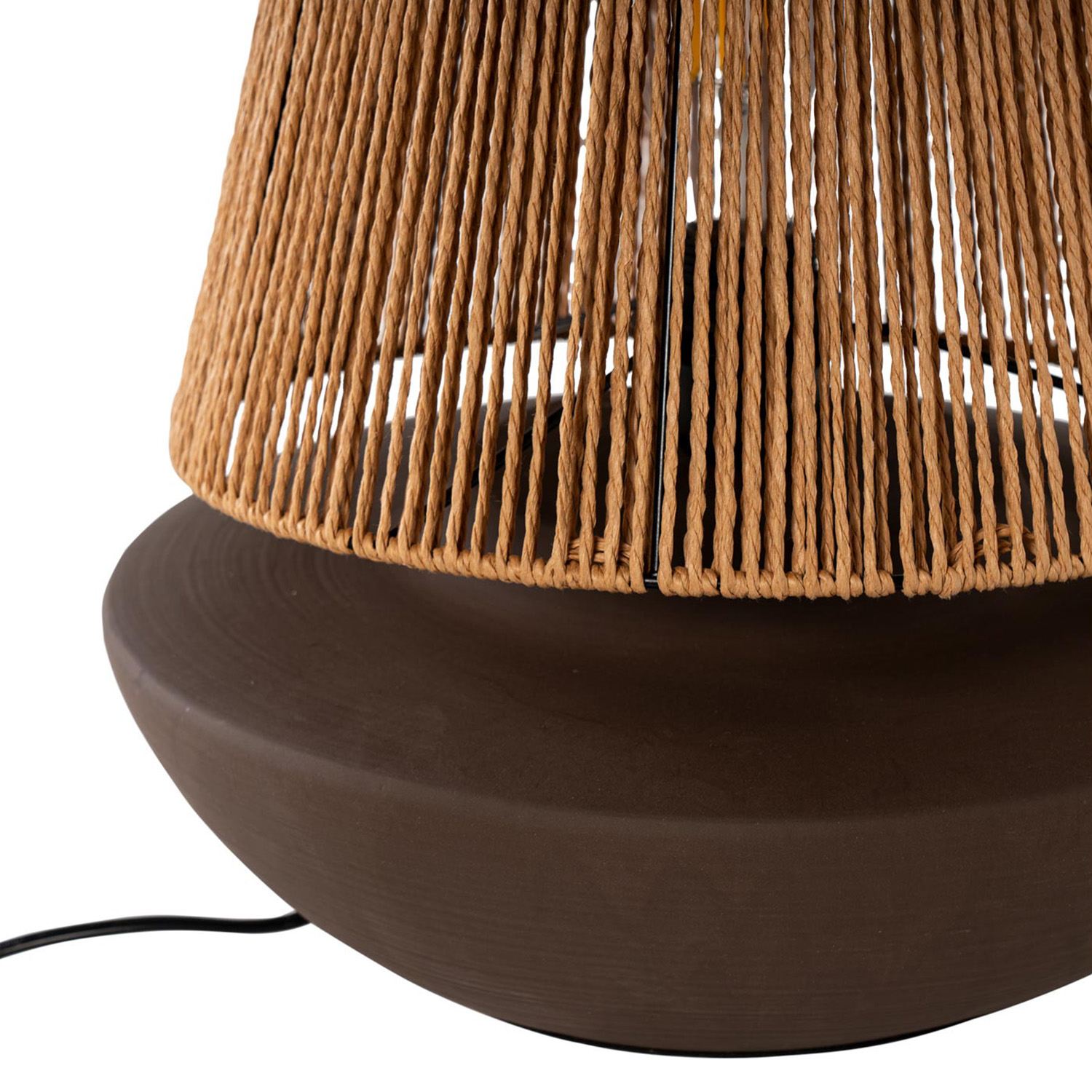 Su base de cerámica en tono café no solo proporciona una estructura robusta y estable, sino que también añade un toque de refinamiento a la decoración. La pantalla de cuerda de cáñamo, por su parte, permite una difusión de luz suave y envolvente, generando un ambiente acogedor y relajante.