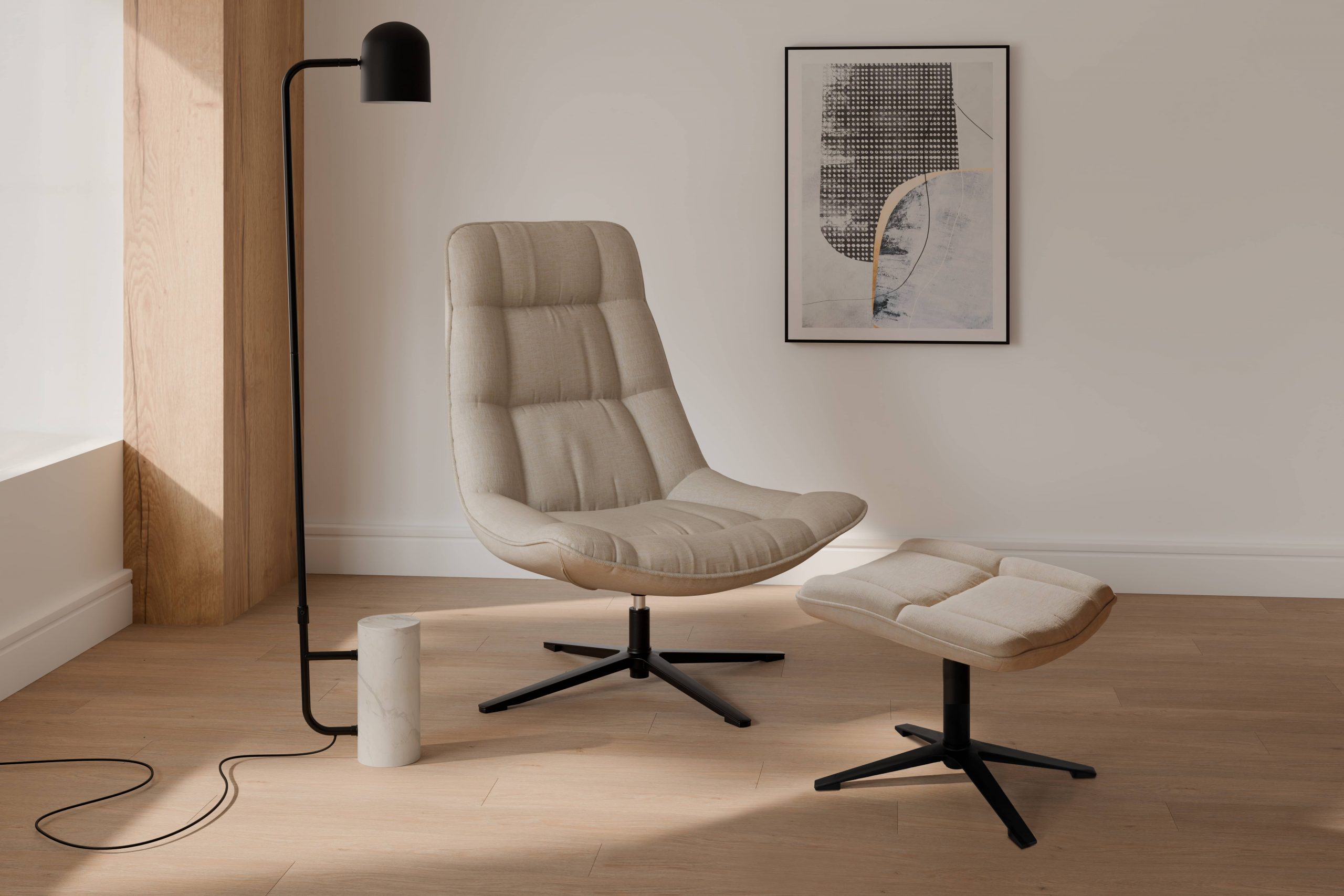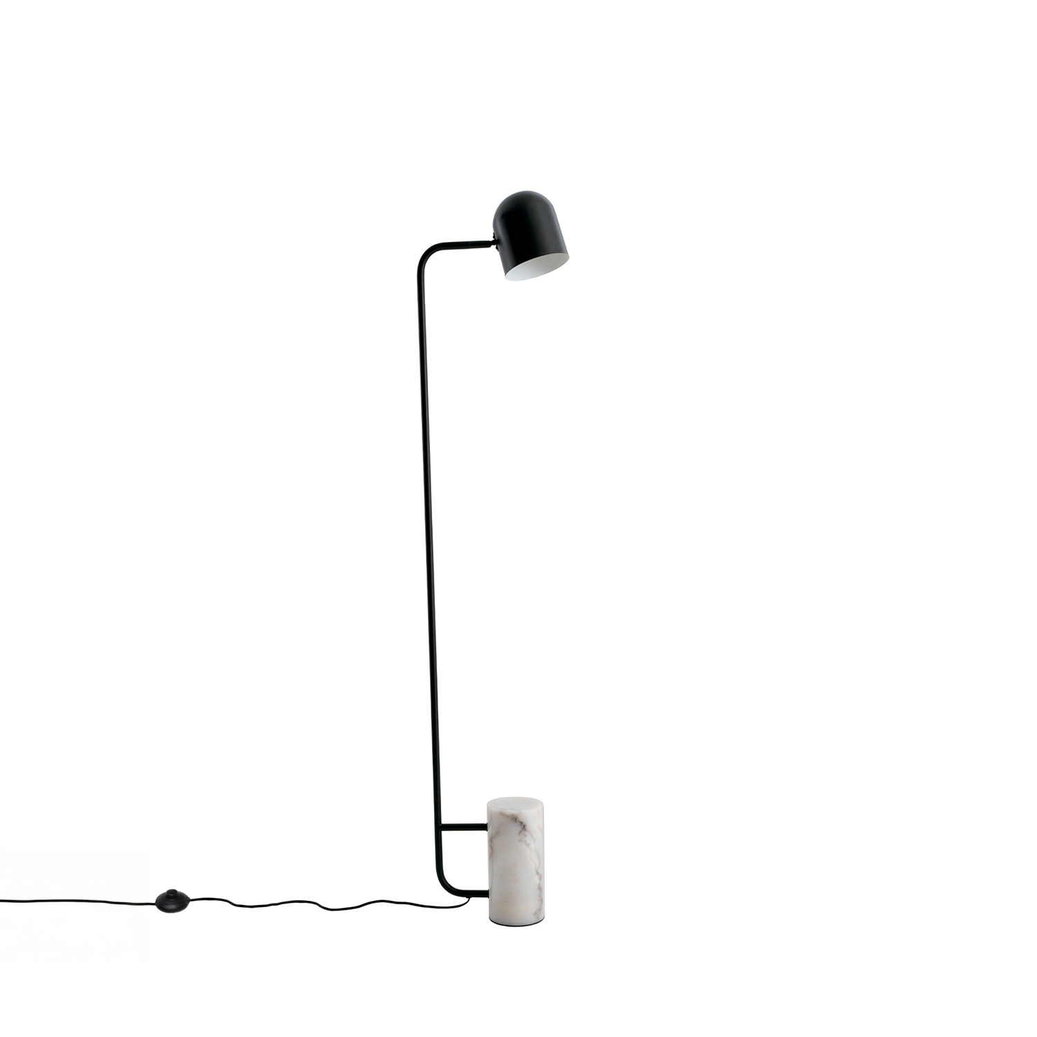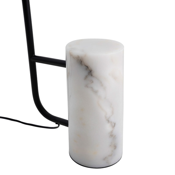La lámpara de suelo BEJIS combina materiales nobles con un diseño minimalista y elegante. Su estructura metálica en negro se alza con líneas limpias y estilizadas, mientras que la base de mármol blanco moteado aporta estabilidad y un contraste visual sofisticado.