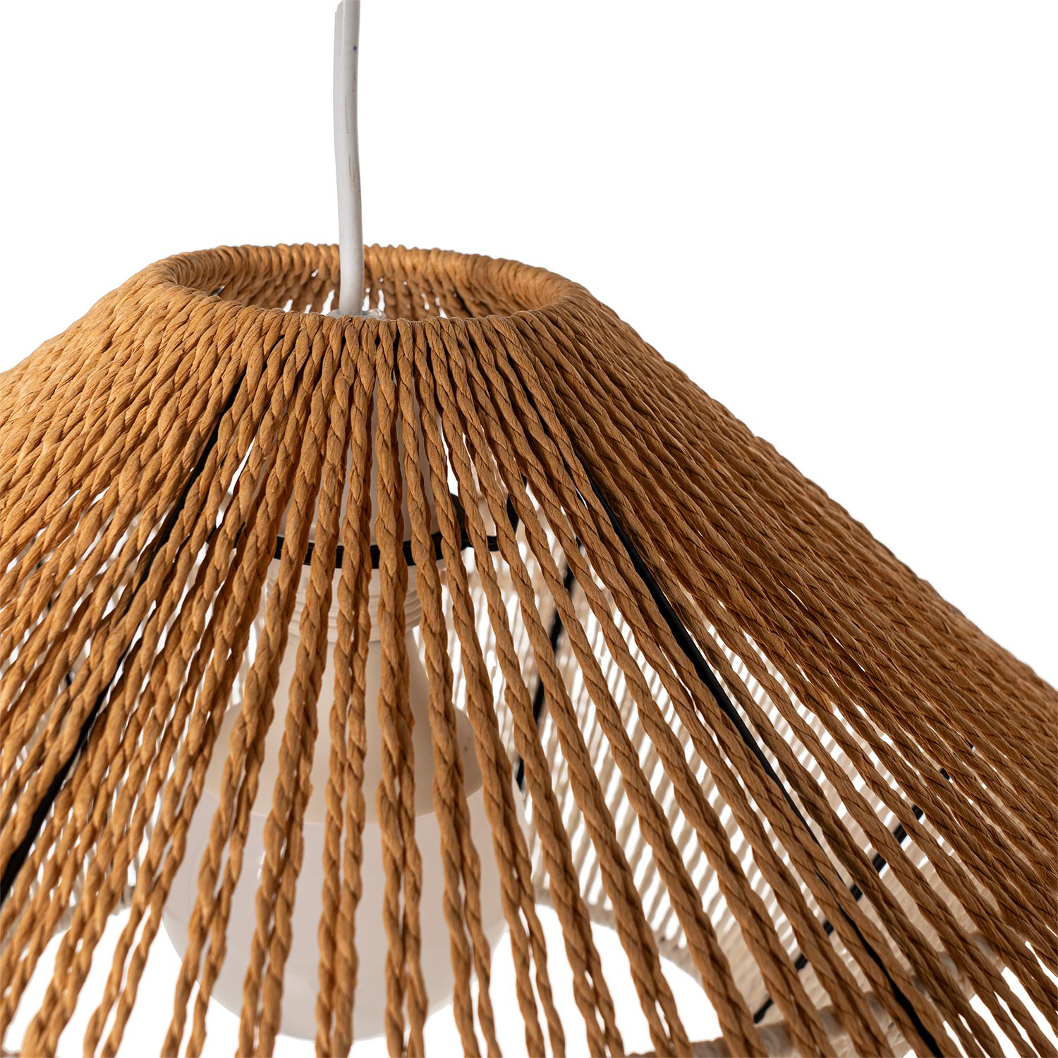 La lámpara de techo BRENES aporta una estética natural con un sutil aire artesanal, perfecta para ambientes relajados y con carácter. Su diseño combina una estructura metálica discreta con un elaborado entramado de cuerda de cáñamo en dos tonalidades, creando un juego de texturas y luces cálidas que llenan el espacio de personalidad.