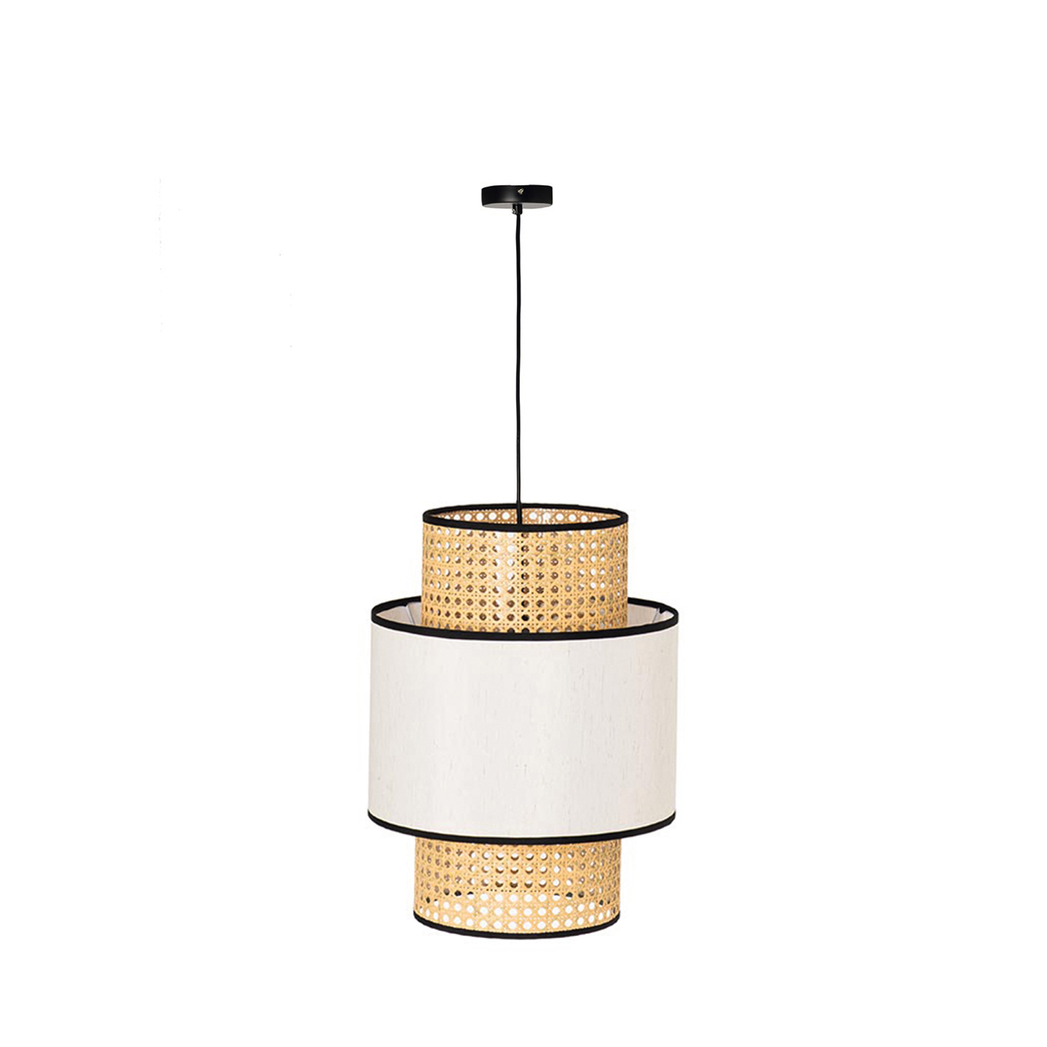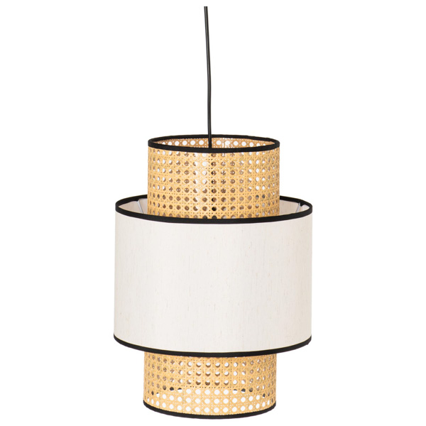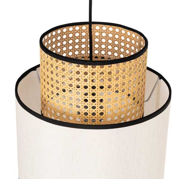 La lámpara de techo LUJAR aporta calidez y naturalidad con una estética suave y envolvente. Su pantalla combina tela y ratán, creando un juego de texturas que filtra la luz con delicadeza y genera una atmósfera acogedora.