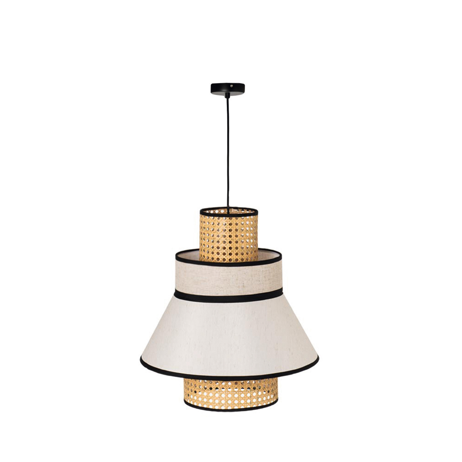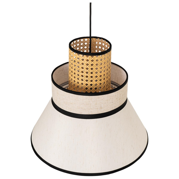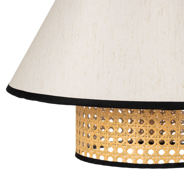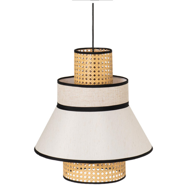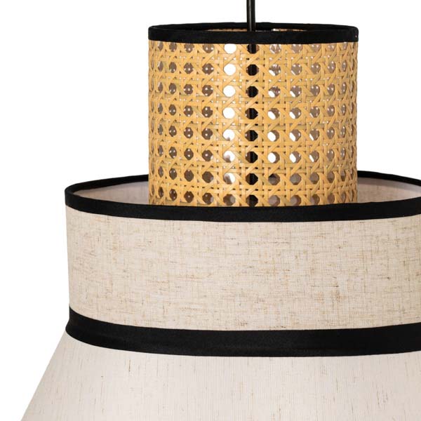 La lámpara de techo NERJA fusiona materiales naturales y diseño contemporáneo en una pieza llena de encanto. Su pantalla combina tela y ratán, permitiendo una iluminación cálida y suave que transforma cualquier espacio en un ambiente acogedor.