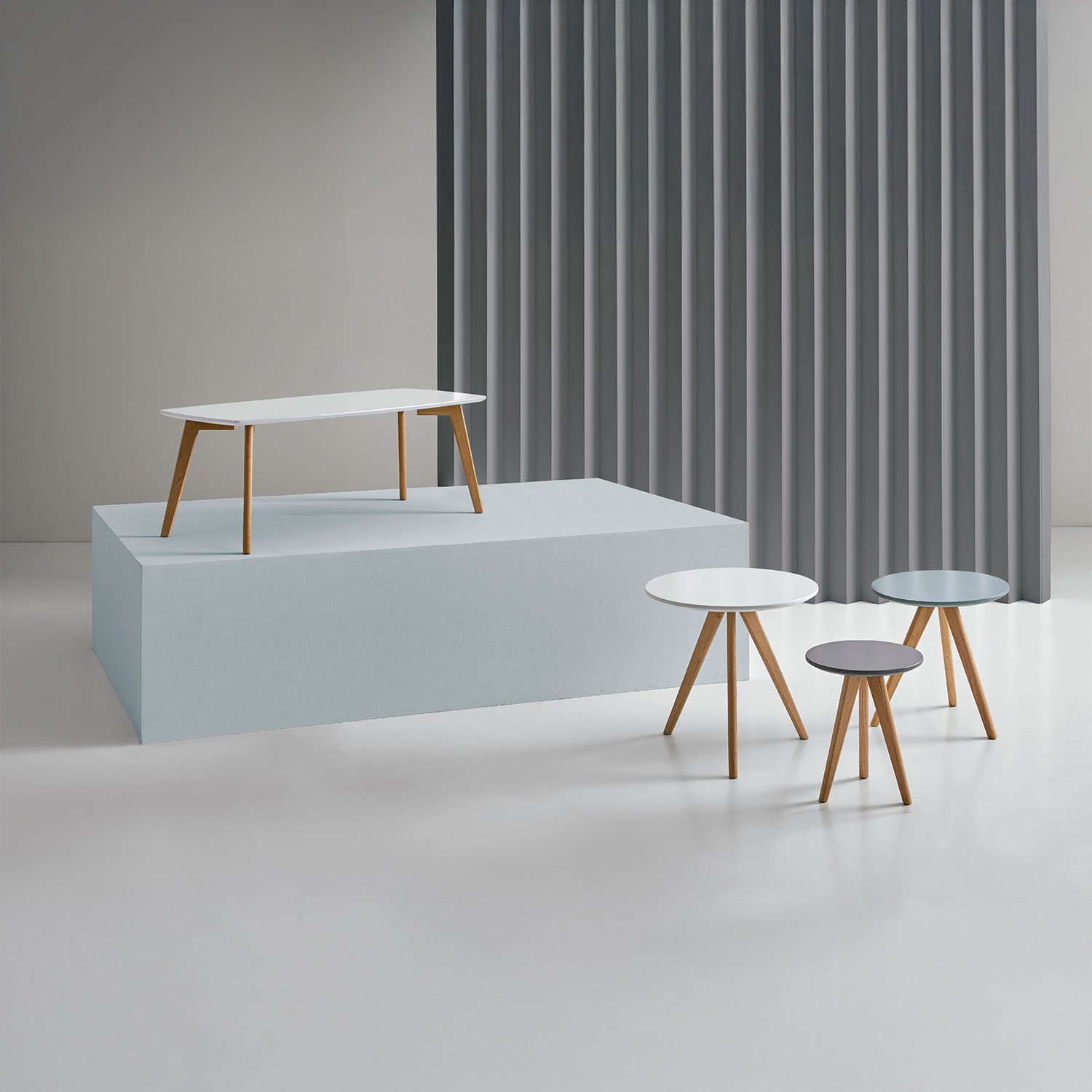 La tapa, de superficie lisa y acabado lacado en blanco, aporta un toque de frescura y luminosidad al conjunto, contrastando delicadamente con la base en madera de roble, que exhibe sus vetas naturales y tonos cálidos. Esta combinación de materiales crea un equilibrio perfecto entre modernidad y calidez, ideal para ambientes nórdicos, minimalistas o escandinavos.