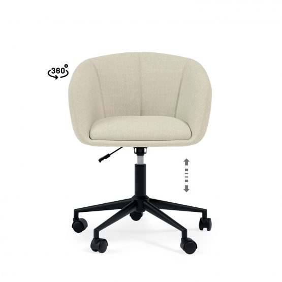 Su estructura minimalista en color blanco se complementa con un tapizado disponible en gris, mostaza o menta, colores que aportan una estética limpia, contemporánea y adaptable a diferentes estilos de decoración. Su forma curvilínea está diseñada para ajustarse de manera natural a la espalda, ofreciendo un soporte ergonómico que prioriza la comodidad durante largas horas de uso.