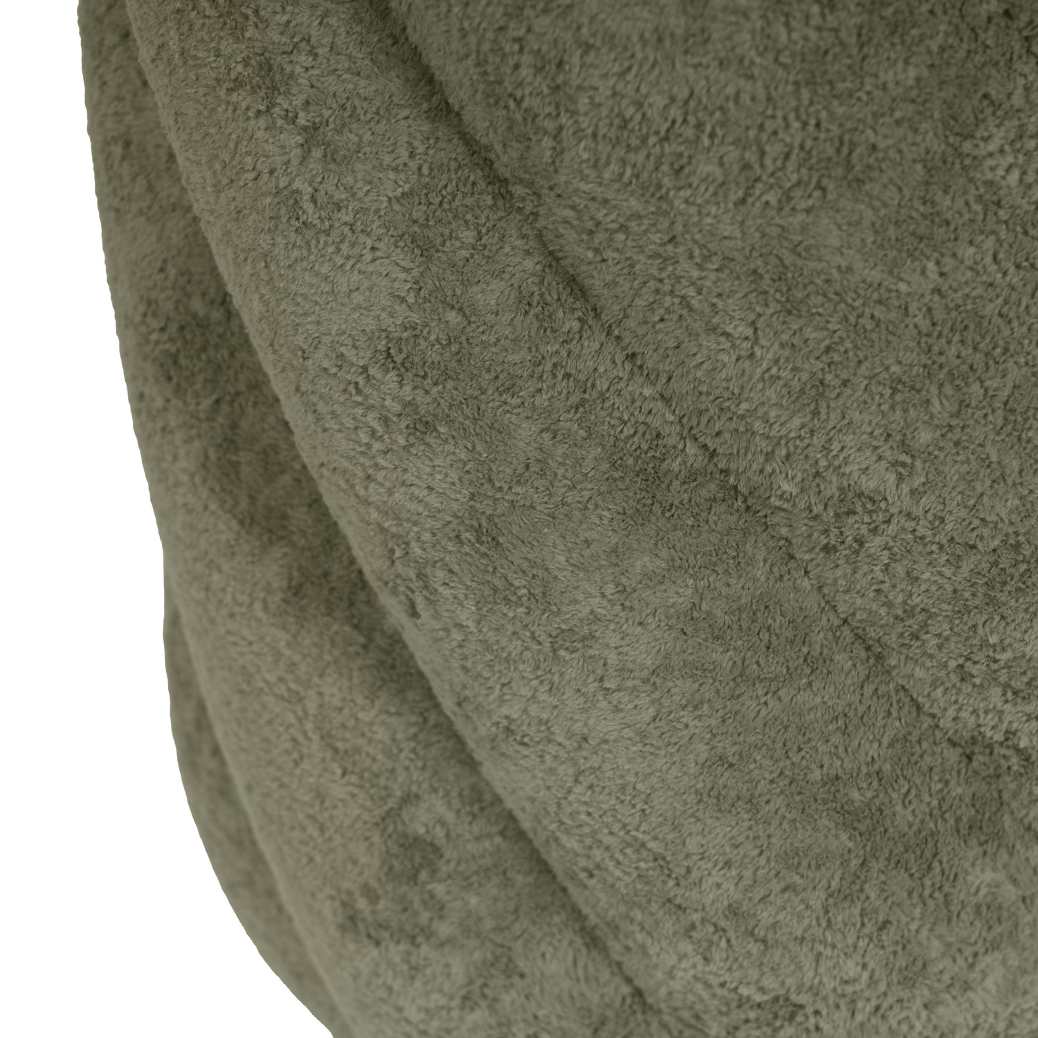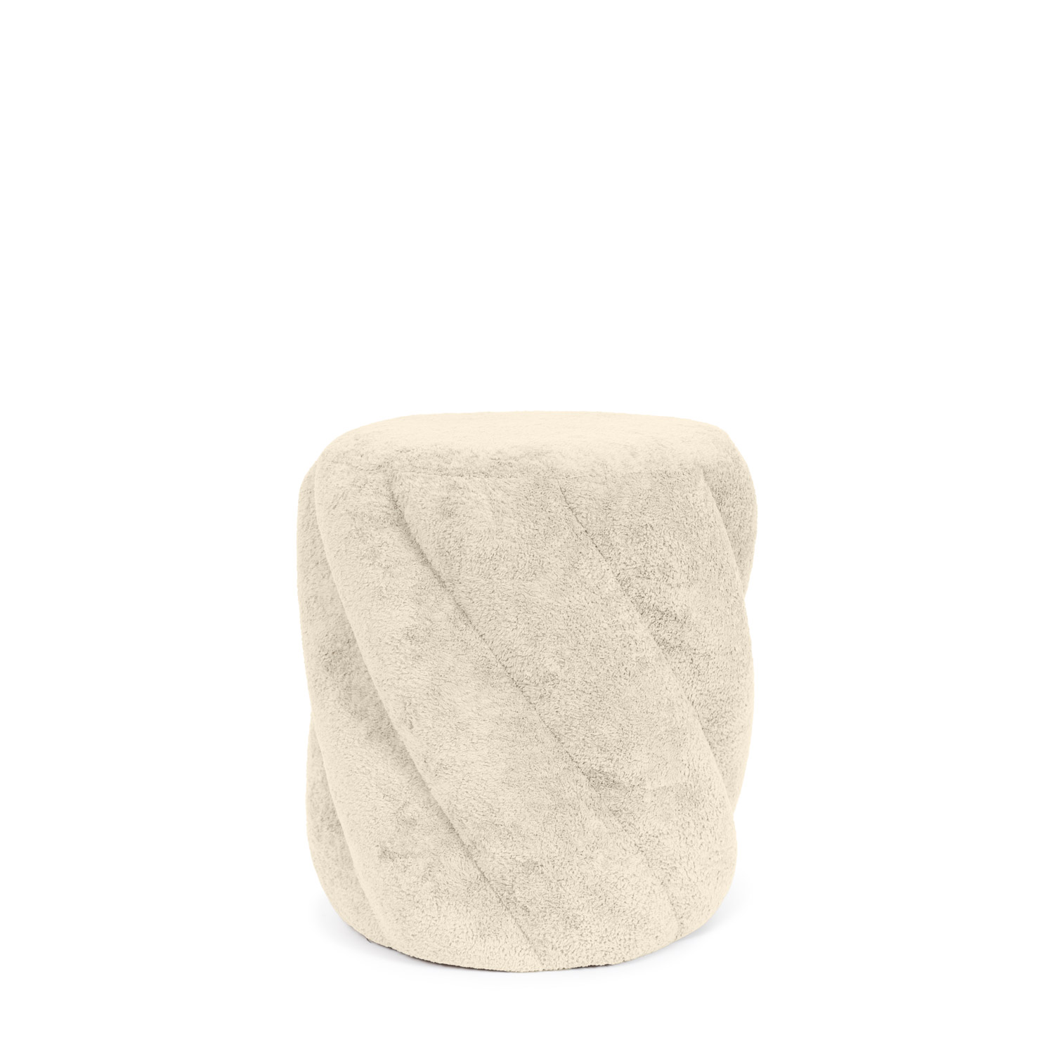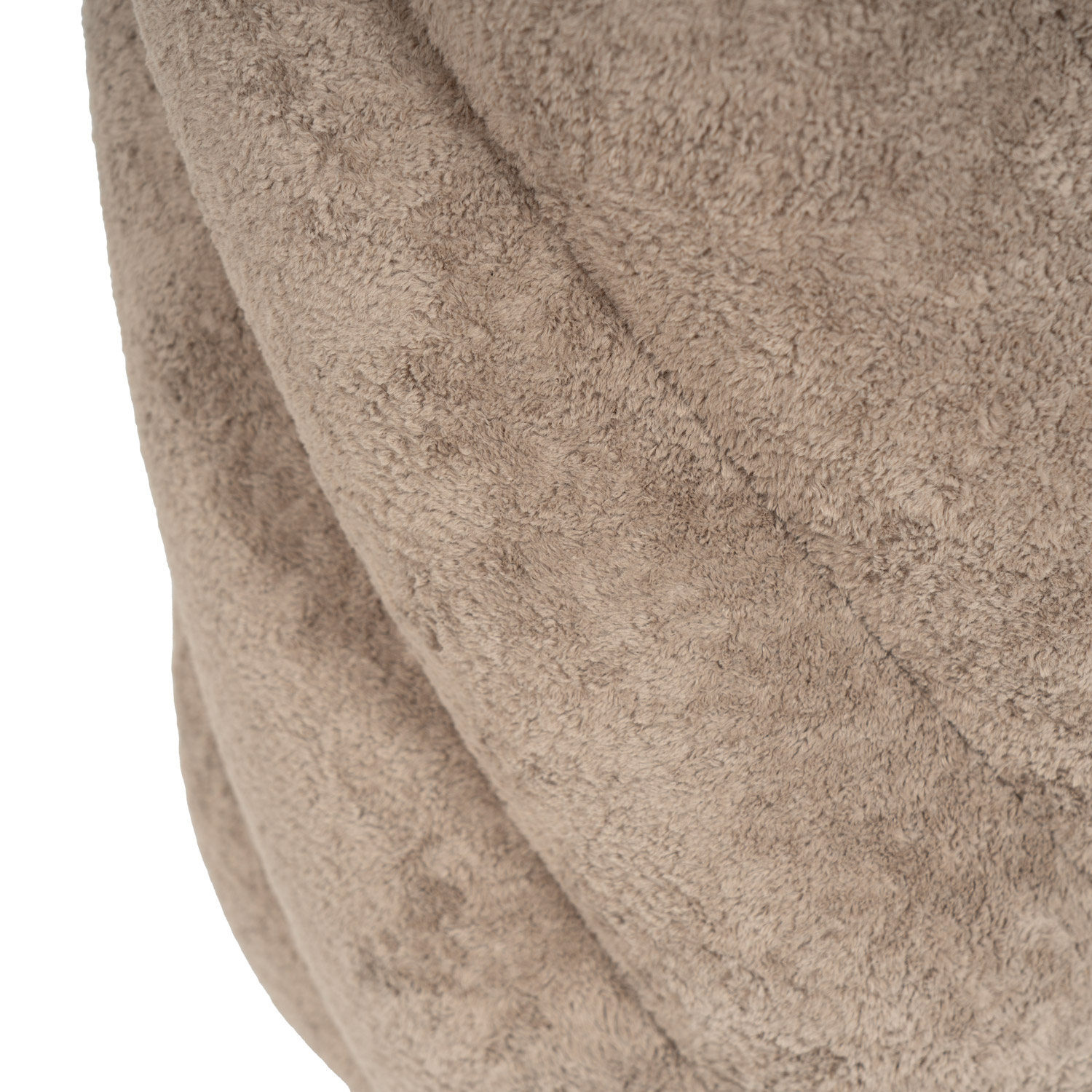 El tapizado de poliéster, de tejido teddy, potencia esta forma fluida y escultórica, aportando calidez y una sensación acogedora.