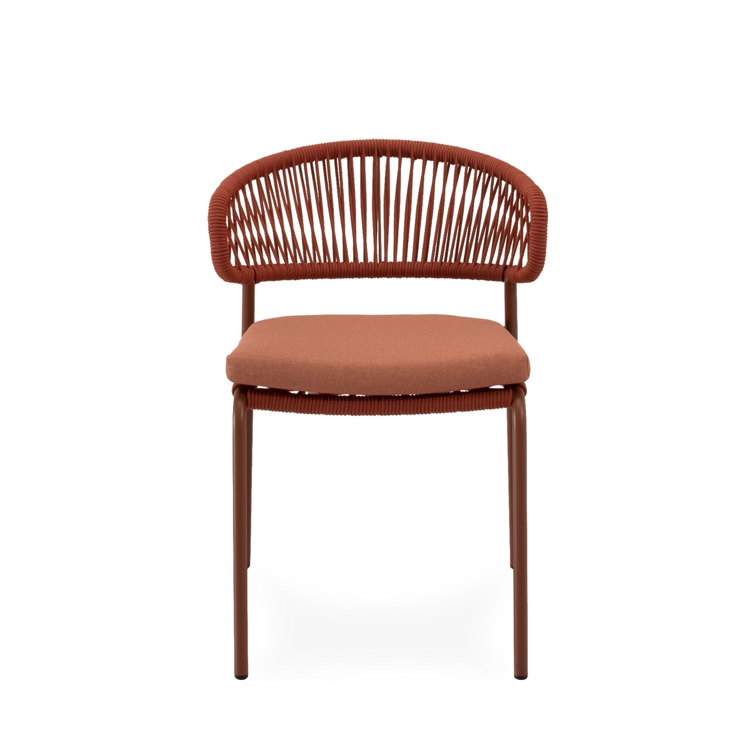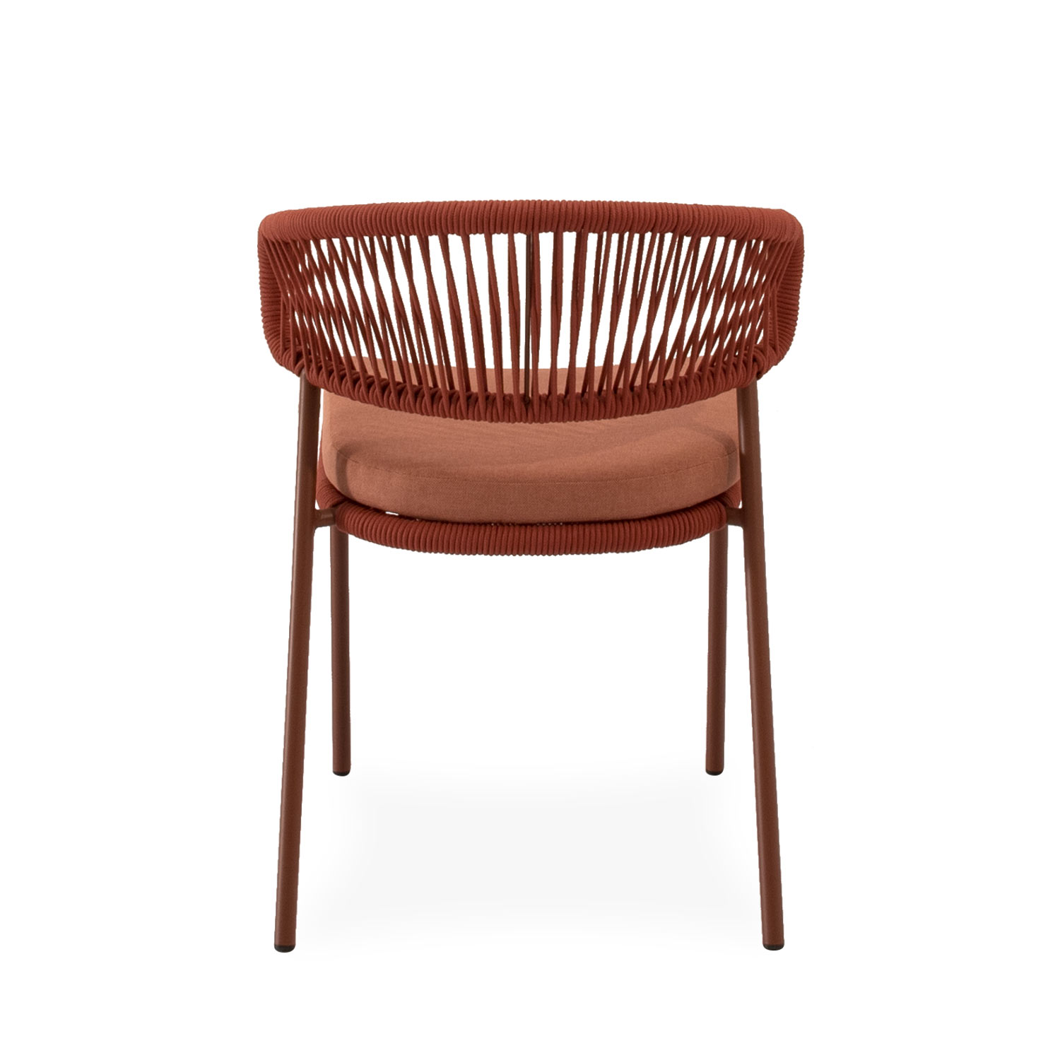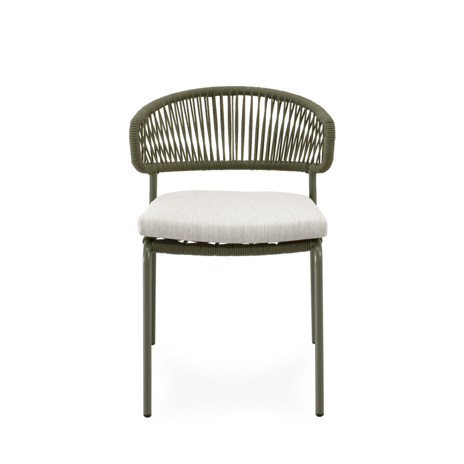 Su estructura de cuerda resistente y patas de acero perfeccionado para resistir al entorno exterior, ofrecen un equilibrio perfecto entre estabilidad y estilo, mientras que el asiento acolchado en poliéster proporciona un confort duradero. El respaldo curvo, además de sumar un toque decorativo discreto, favorece una postura cómoda y natural.