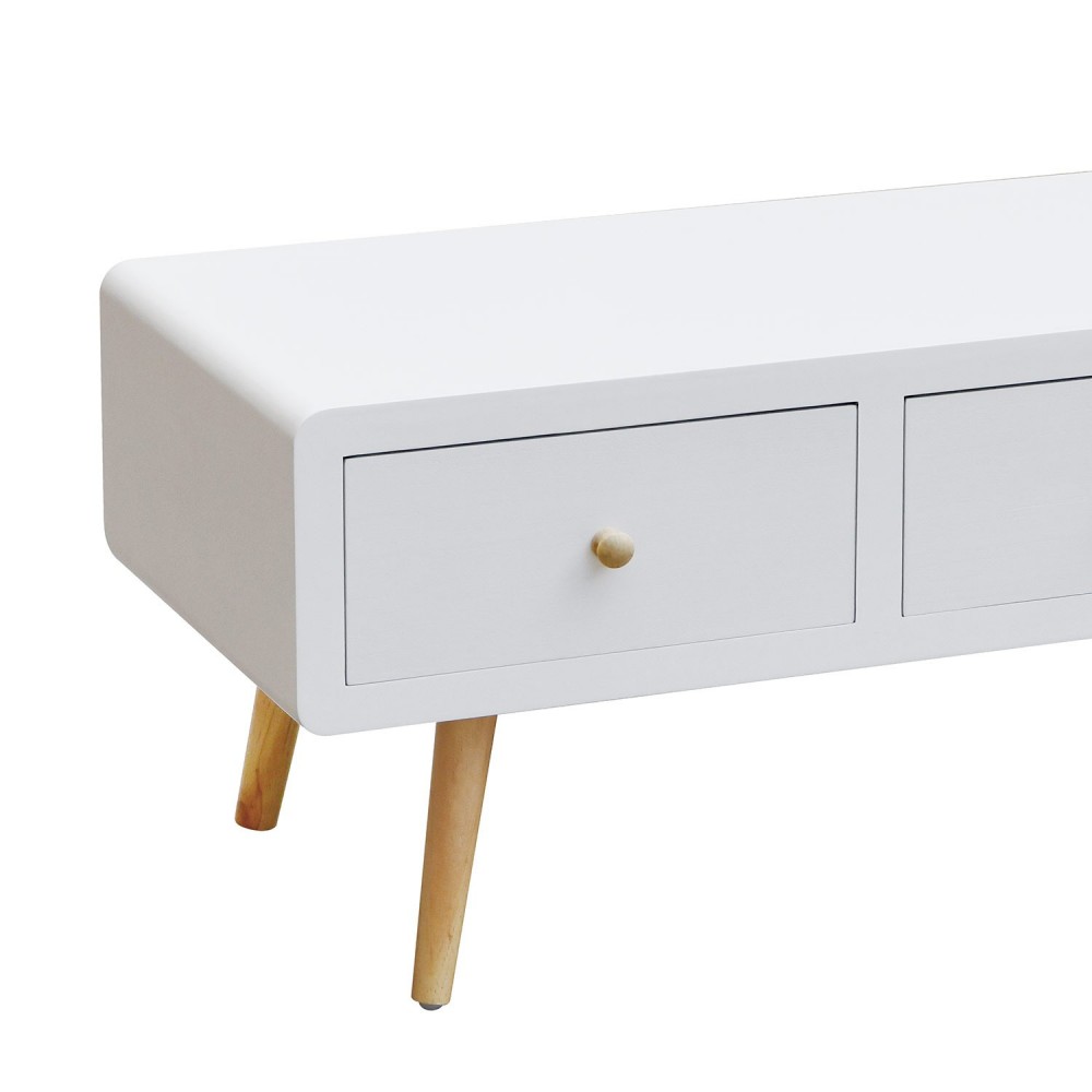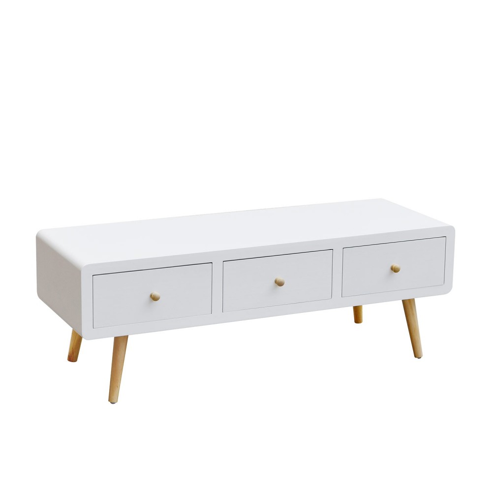 Mueble fabricado en MDF color blanco y patas de pino en color natural. Se sirve desmontado. Medidas: Ancho: 110 cm Alto: 38 cm Profundo: 38 cm