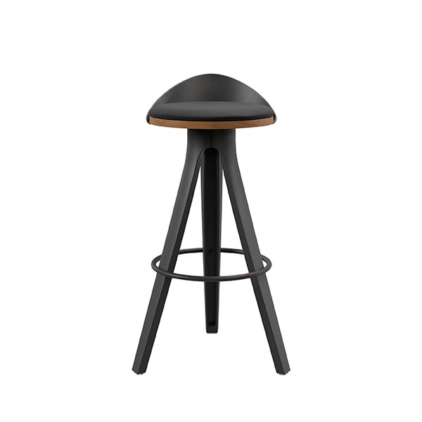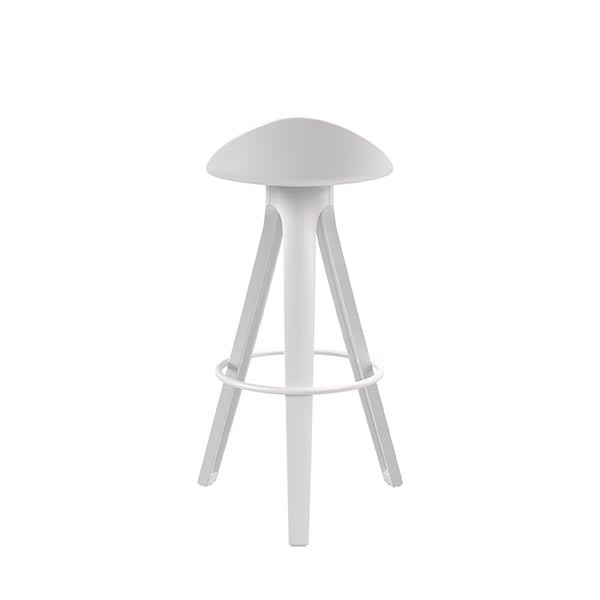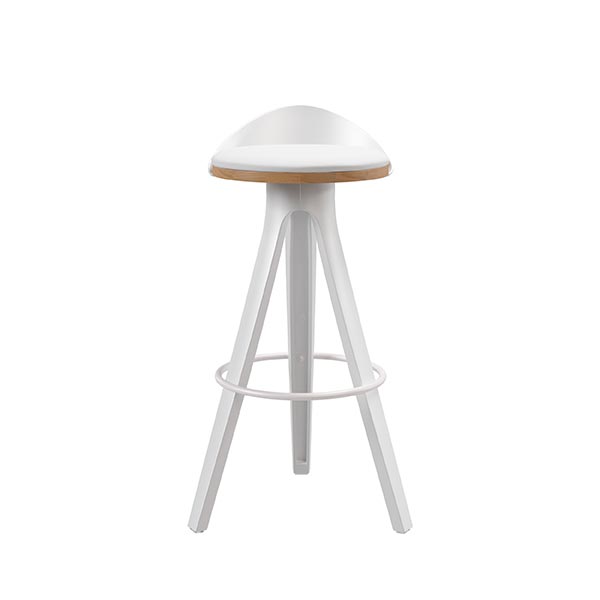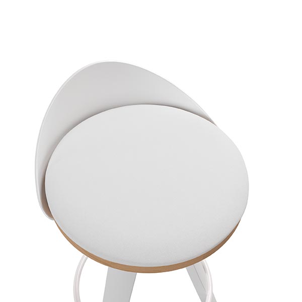 Además, cuenta con un reposapiés circular y patas de polipropileno en color blanco cuya combinación con el tono natural de la madera hace que este taburete sea visualmente atractivo y versátil, adaptándose a diversos estilos de interiores.