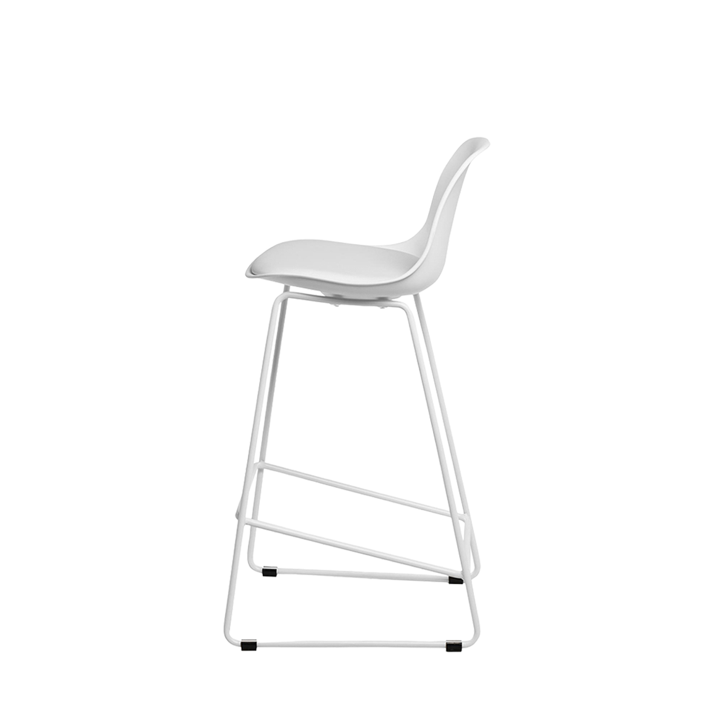 Sus patas metálicas, también en blanco, incluyen un reposapiés cuadrado con una ligera inclinación, proporcionando mayor estabilidad y un aspecto más refinado.