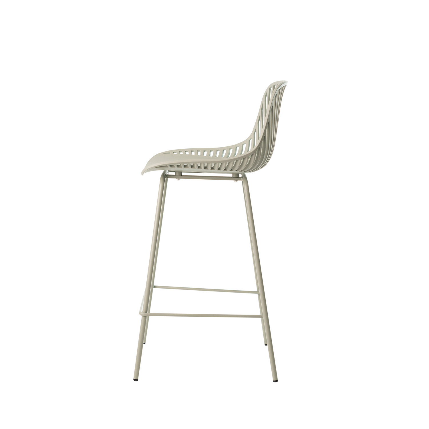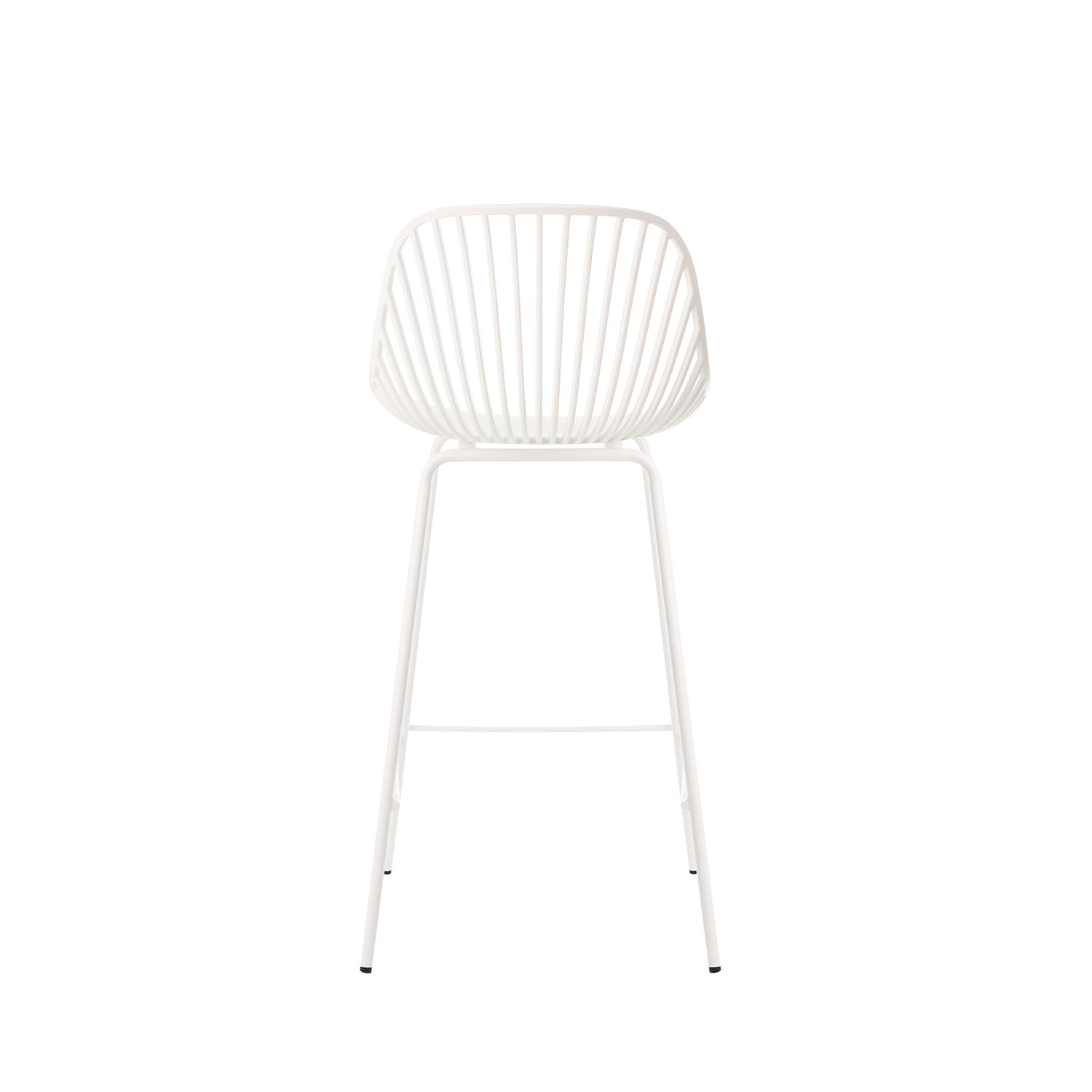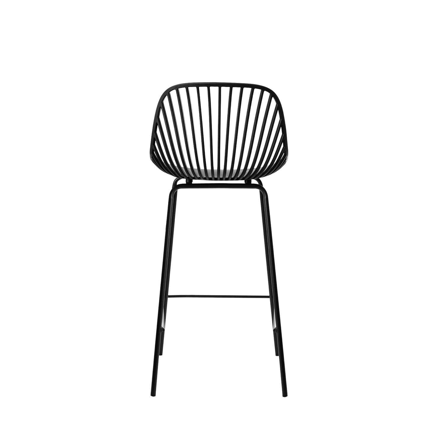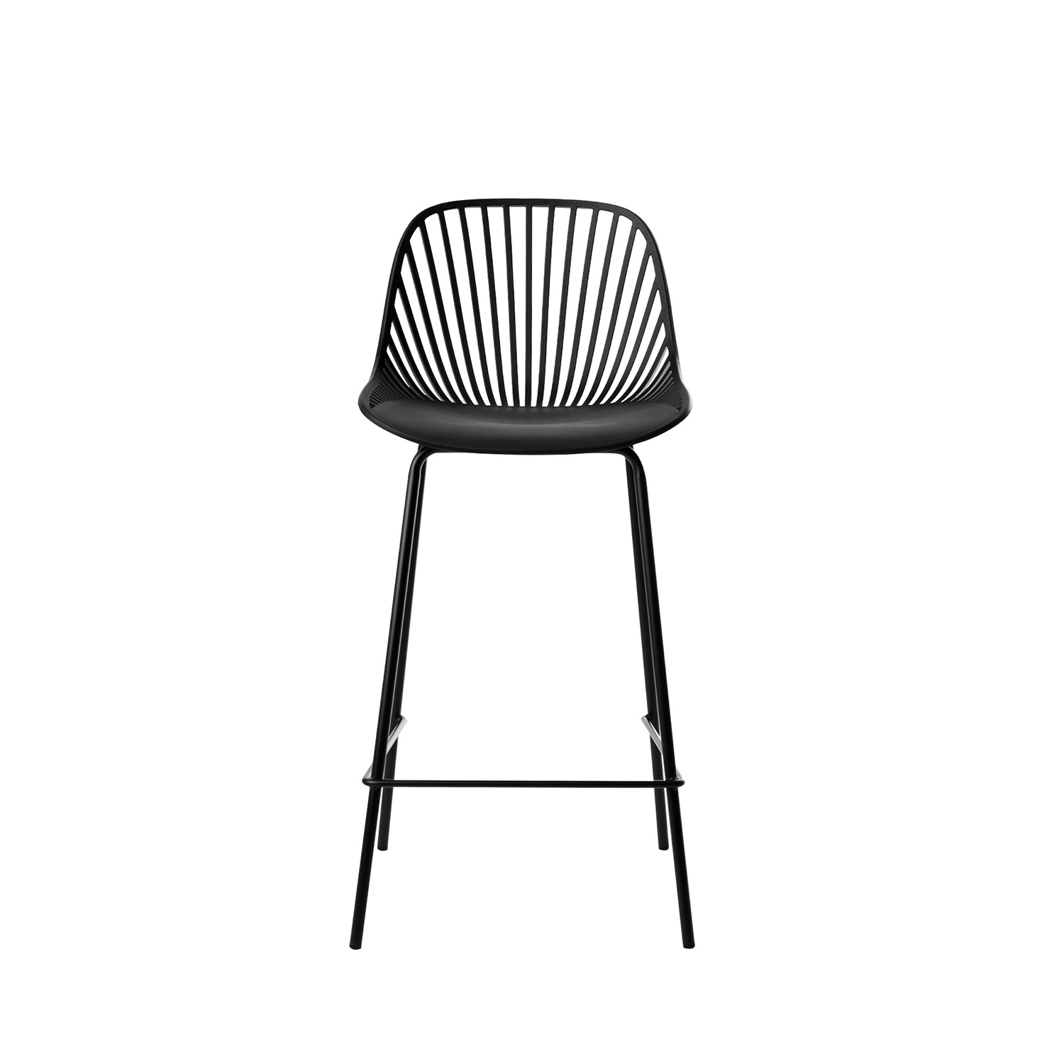 El taburete bajo PEYTON destaca por su diseño original, con un respaldo abierto compuesto por pequeñas barras verticales y un asiento de polipropileno en color negro, todo en una misma pieza.