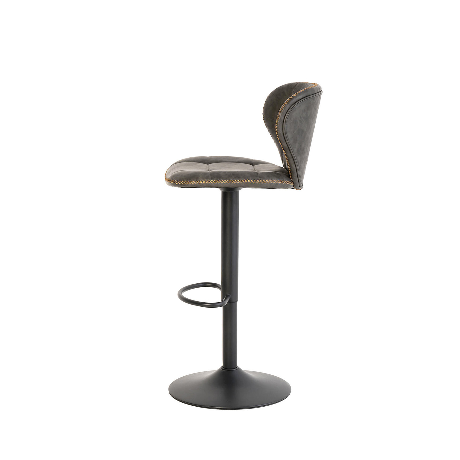 El asiento y el respaldo están tapizados en polipiel gris, con costuras visibles que añaden un toque de estilo adicional. El respaldo, ligeramente curvado, proporciona un soporte extra, mientras que el reposapiés integrado aumenta la comodidad.