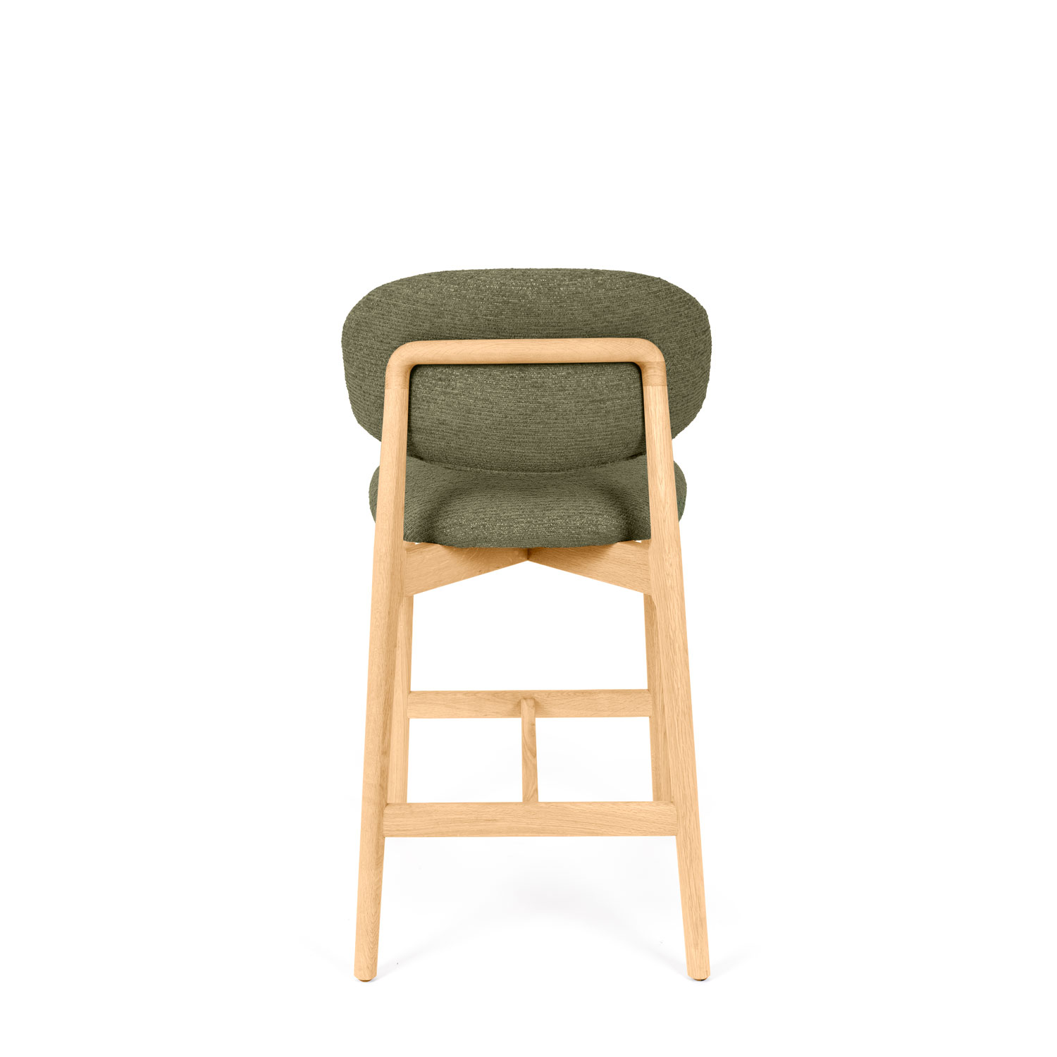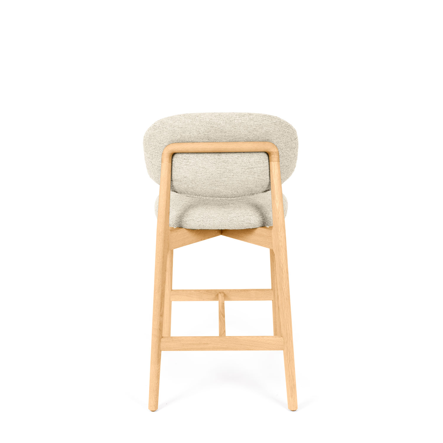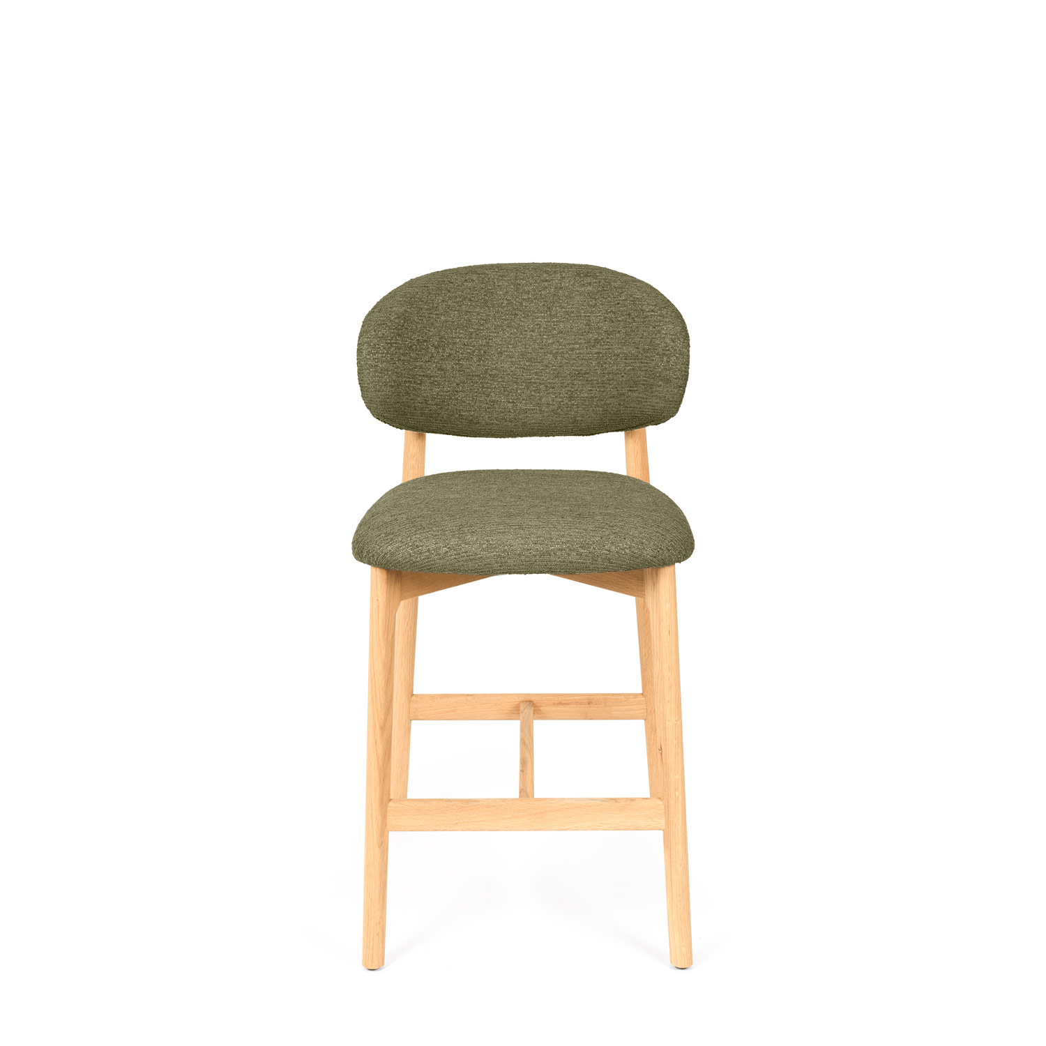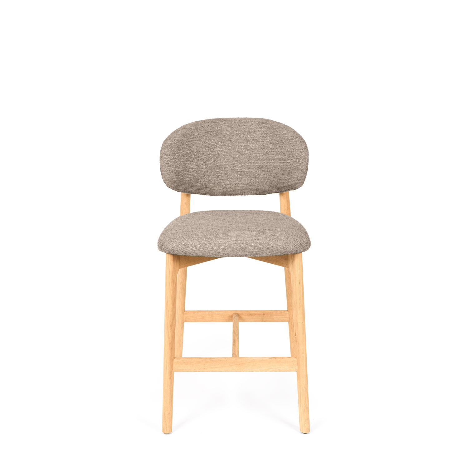 El taburete RENZO destaca por su equilibrio entre diseño, confort y estructura. Su base en madera de haya aporta solidez y calidez visual, mientras que las patas, ligeramente cónicas y unidas por travesaños en cruz, refuerzan la estabilidad y le otorgan un carácter artesanal muy cuidado.
