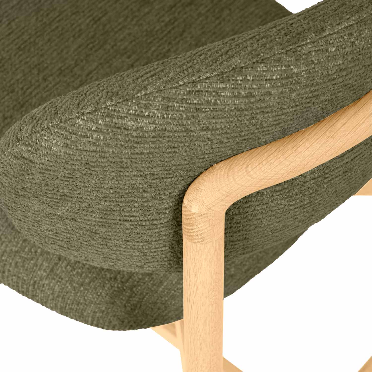 Está disponible en tonos beige, verde y taupe, y uno de sus mayores atractivos es la estructura trasera en madera vista, que enmarca el respaldo con elegancia y se convierte en un detalle distintivo cuando se observa desde cualquier ángulo.