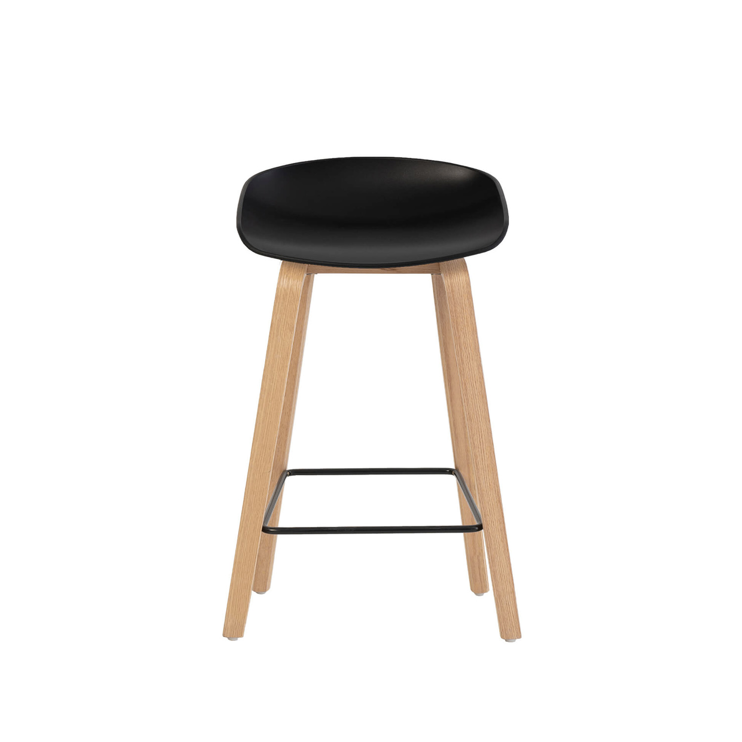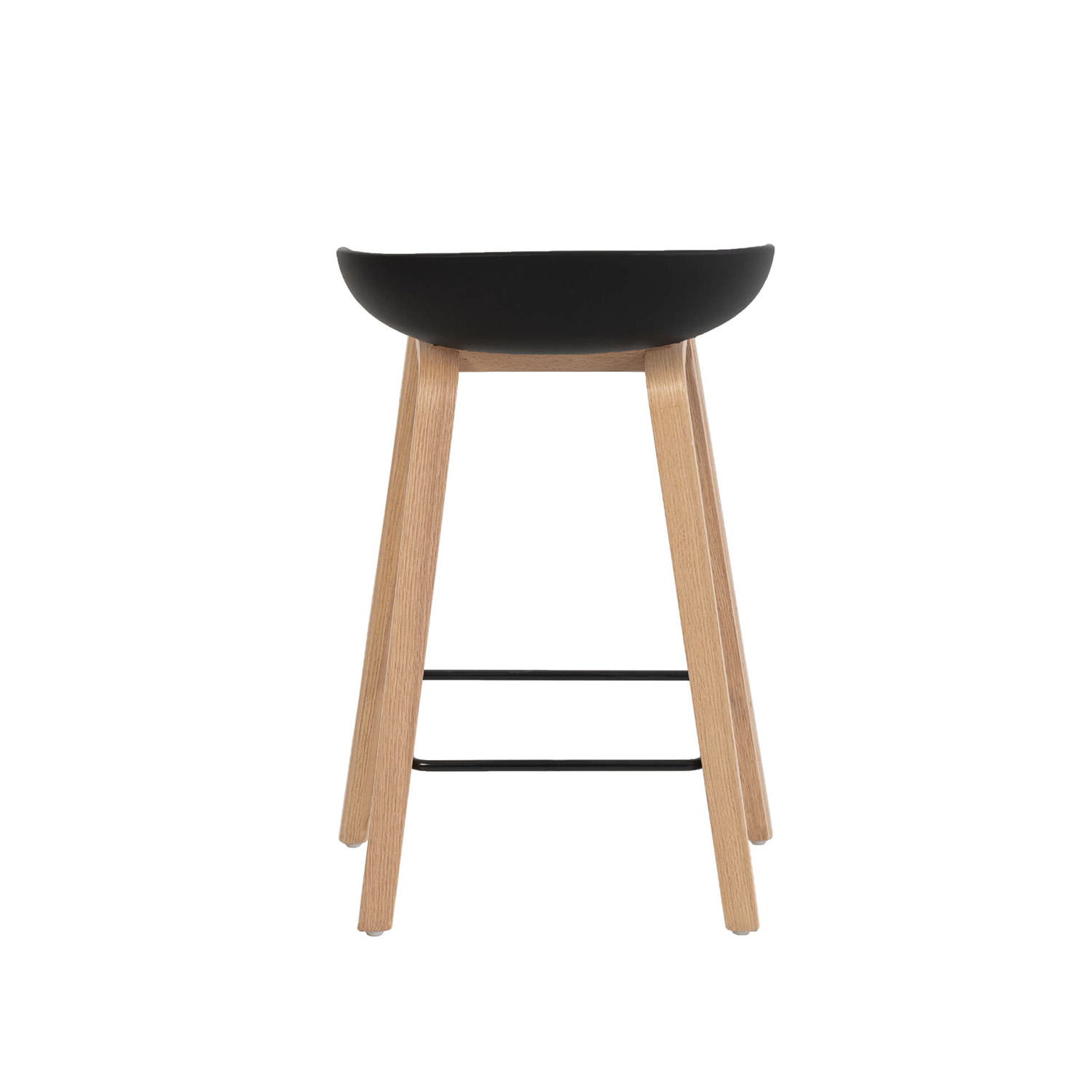El contraste con las patas de madera en forma de ‘U’ invertida y el reposapiés metálico en negro le confiere un toque elegante, además de proporcionar un soporte robusto y estable.